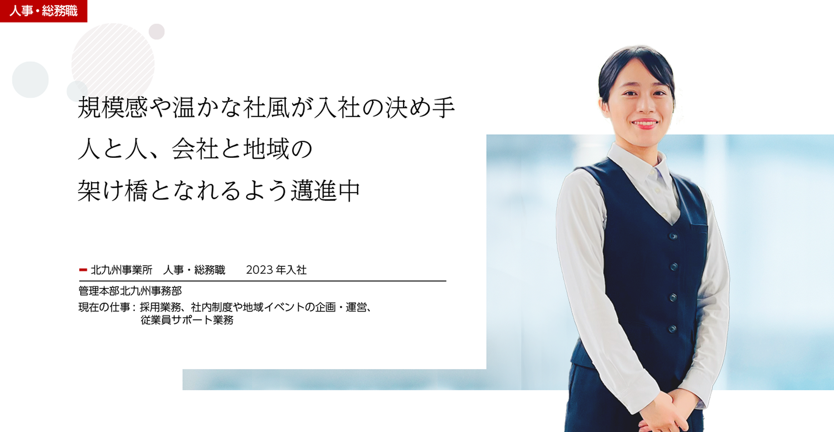 現在は北九州事業所で、総務、人事、広報業務を担当。出張をはじめとした各種申請書の受付・チェック、社内制度の事務局、来客対応といった日常業務に加え、派遣社員の職場見学や高卒採用業務にも携わっています。入社当初は電話応対も緊張の連続でしたが、3年目の今では社内の問い合わせにしっかり応えられるようになり、感謝の言葉をもらえるとやりがいを感じられるようになりました。上司が不在のときに一人で任される業務も増え、成長を実感しています。