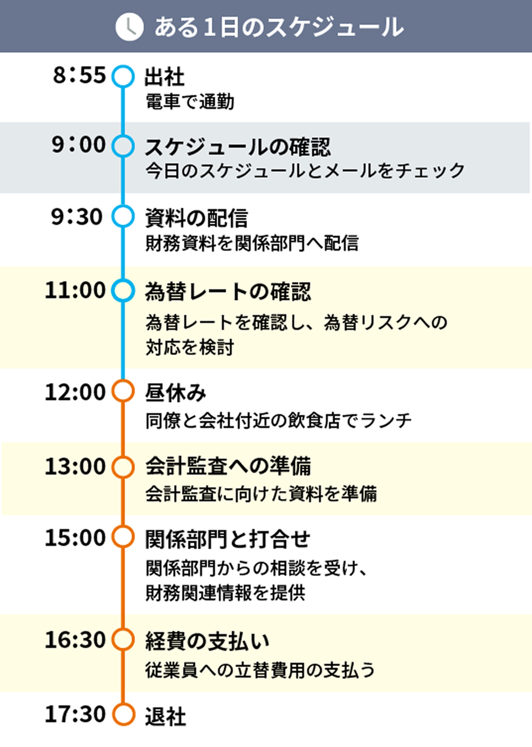 入社後、念願だった財務部門に配属されました。最初は仕訳の作成や為替レート報告など、基礎的な業務からスタートし、現在は資金繰りや予算管理に関する資料の作成、会計監査対応などを担当しています。資金繰りや予算管理では、将来の見通しを立てる難しさを感じる一方で、数字を通じて事業全体を俯瞰できる資料を作成することに、大きなやりがいを感じています。こうした点に、財務業務の魅力があると実感しています。