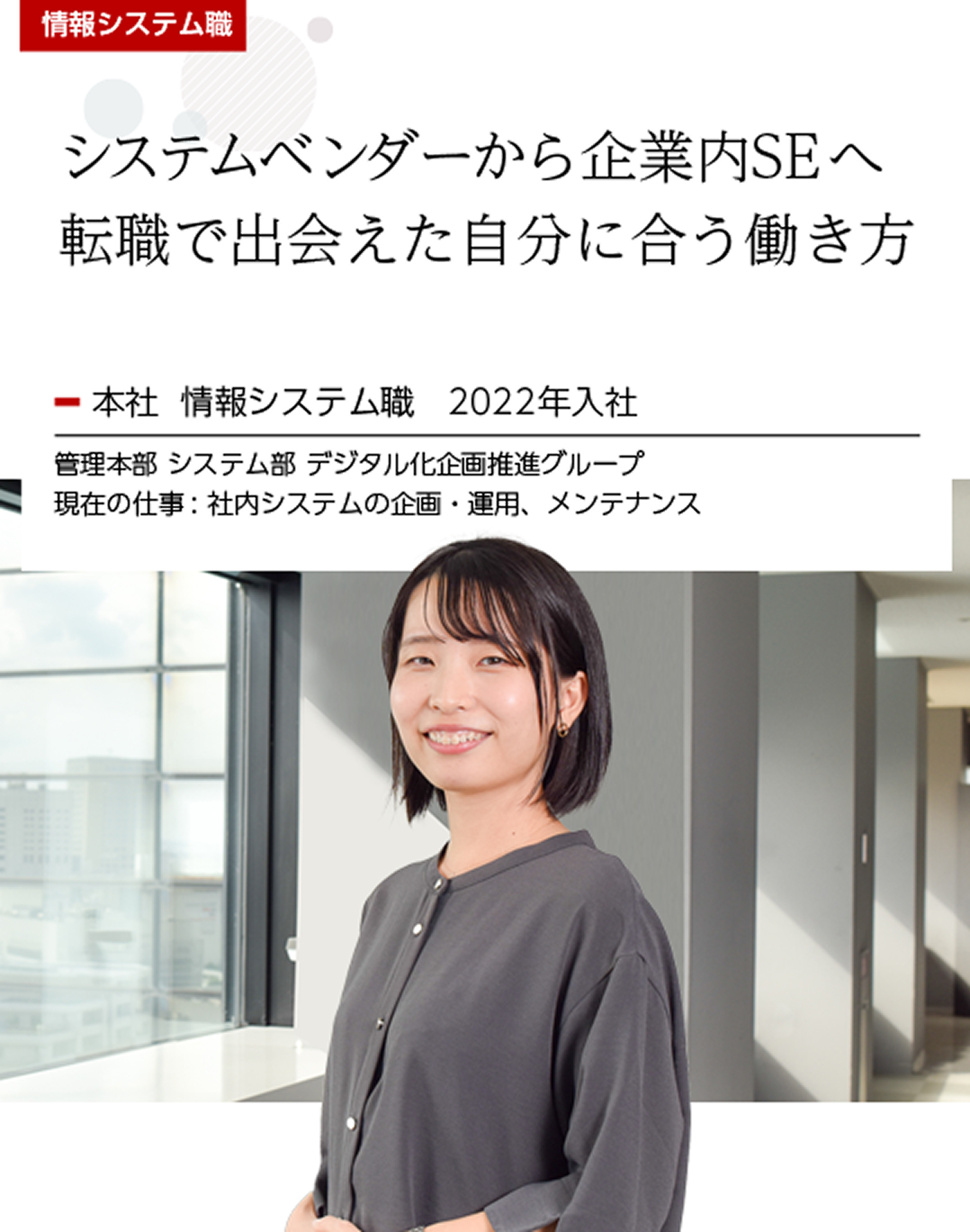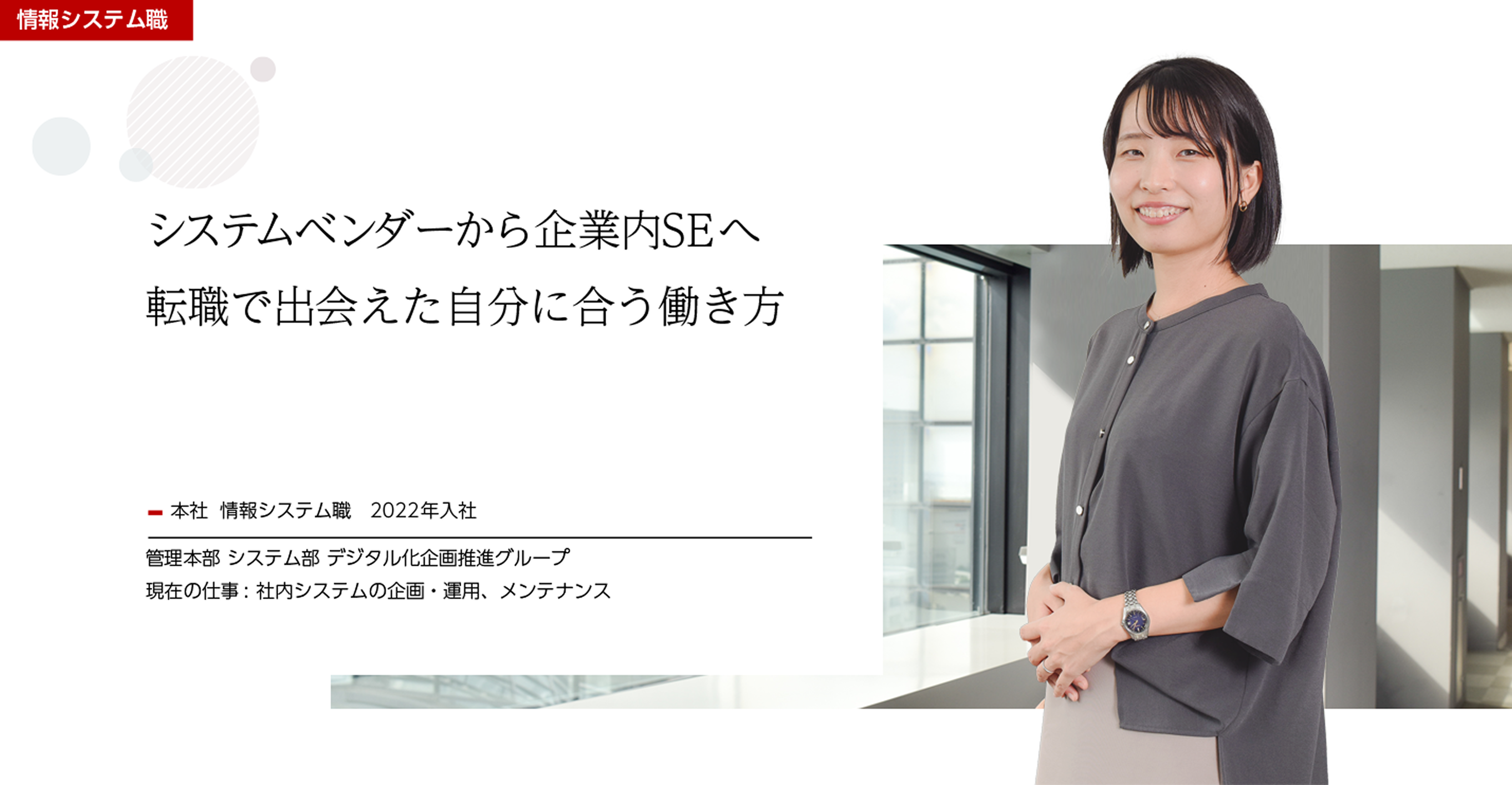 新卒ではシステムベンダーに入社しました。大規模案件に携われる一方、多数のメンバーで分担して作業を進めるため、一部の工程にしか関われないもどかしさや長時間労働の負担を感じていました。この会社に転職してからは、企業内SEとしてプロジェクトの立ち上げから導入まで一貫して関わることができ、その過程に大きなやりがいを感じています。ワークライフバランスも大幅に改善されました。以前は顧客から依頼を受けて外部から支援する立場でしたが、今は自社の一員として内部からシステムを構築・運用する立場となり、同じシステム職でも見える景色や働き方が大きく変わったことを実感しています。