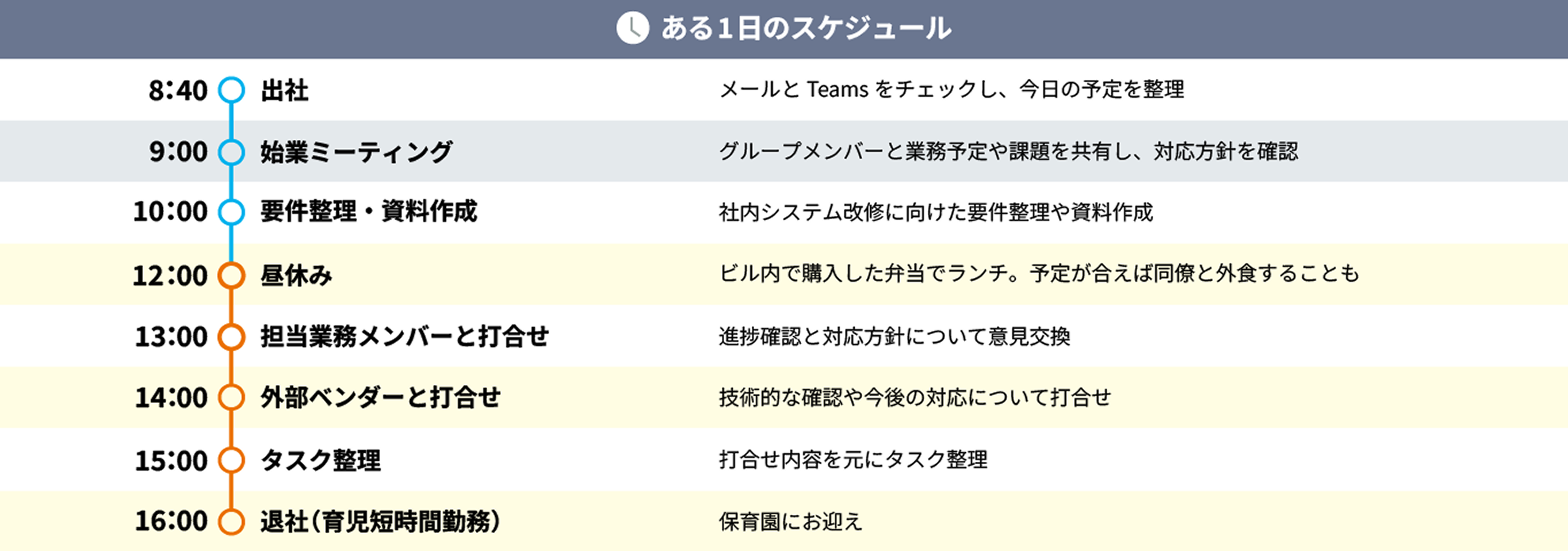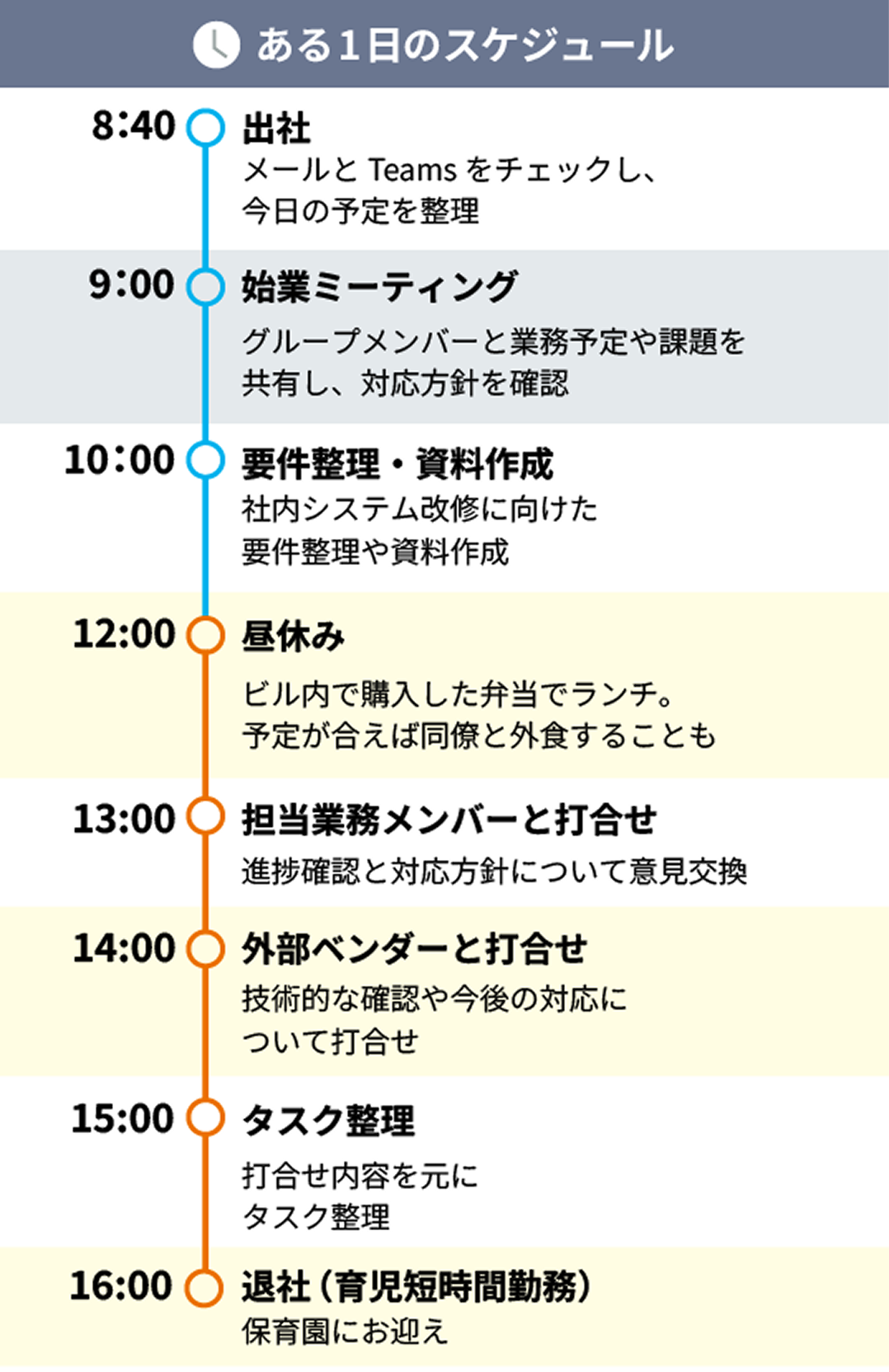 昨年から産休・育休を取得し、今年復帰しました。現在は時短勤務を活用しながら、全社的なERPシステムのリプレイスに関わっています。受注から製造・出荷までをつなぐ、会社の中枢を担うプロジェクトで、複数年にわたって進行中です。復帰面談では「家庭を大切にしながら活躍してほしい」と仕事内容や働く環境に柔軟な配慮をいただき、今は自分のペースを保ちながら、大規模プロジェクトのメンバーとして仕事に取り組めています。